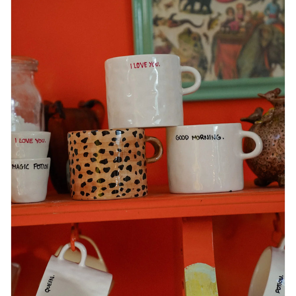Leopard Set šalica za čaj sastoji se od 2 ručno oslikane Anna + Nina šalice, s leopard uzorkom, zapakirano u poklon kutiji.
