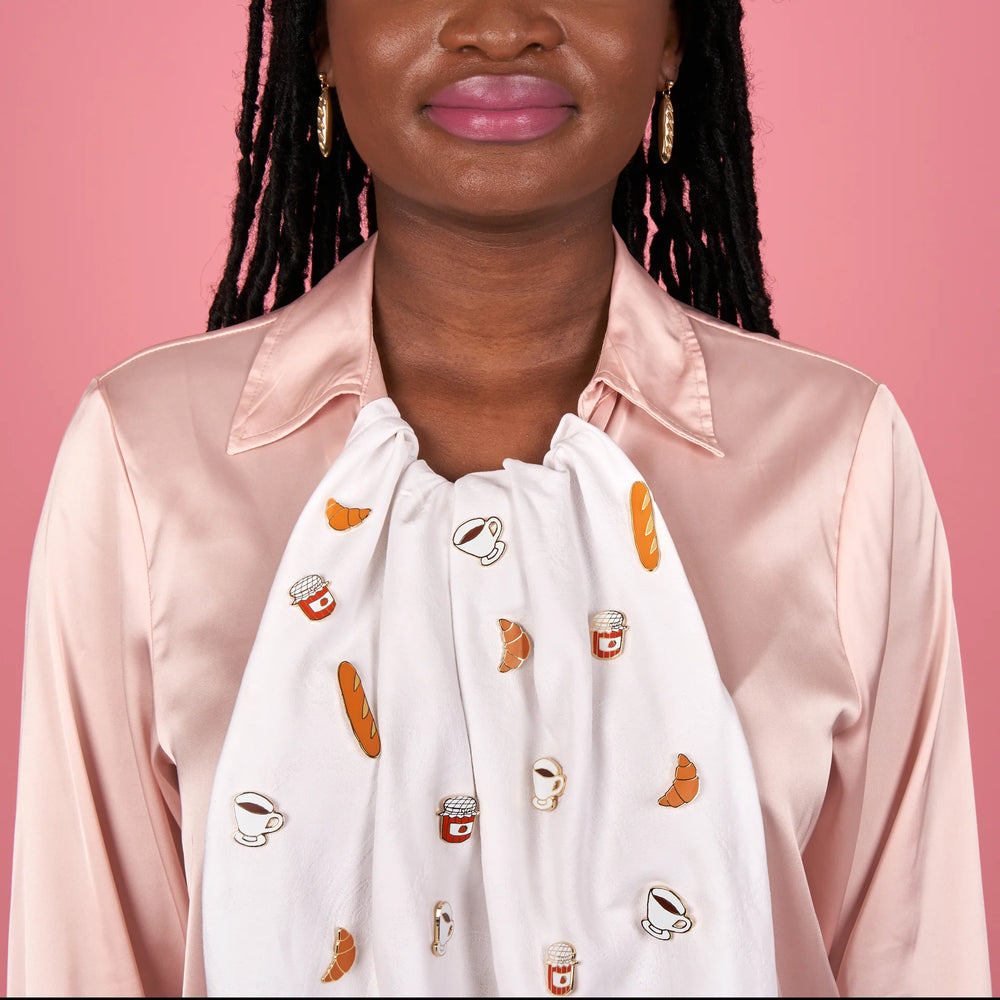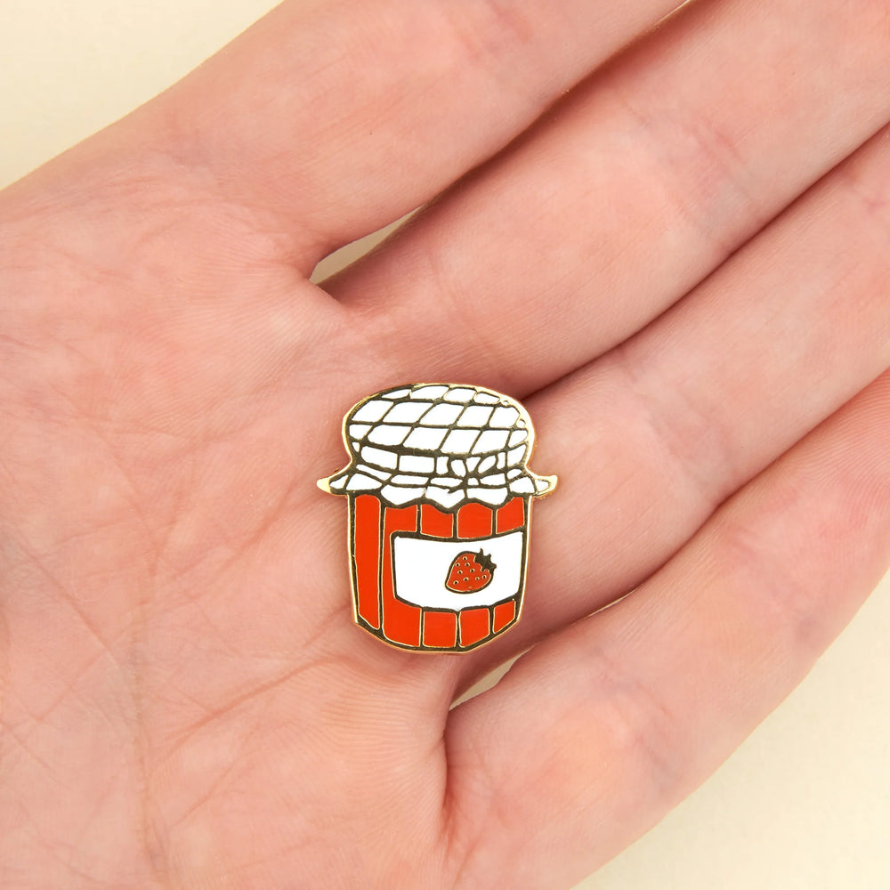 Broš u obliku male staklenke džema od jagoda, zamišljen kao diskretan i razigran detalj za svakodnevno nošenje.