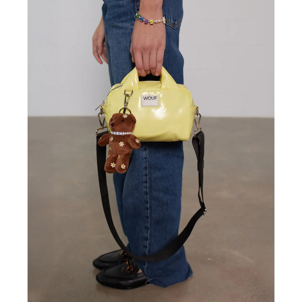 Privjesak u obliku medvjedića s mekanom teksturom, prstenom i kopčom za jednostavno pričvršćivanje na torbu ili ključeve.
